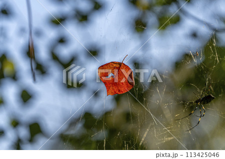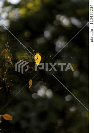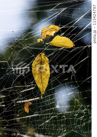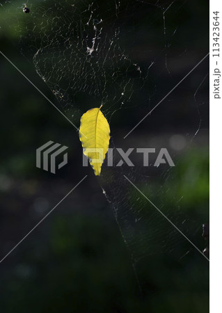 蜘蛛の巣に掴まった黄色く紅葉した落葉