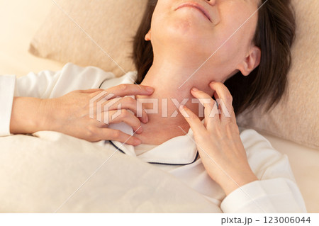 パジャマを着て寝室で痒みに苦しむミドル女性