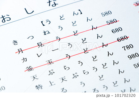 卵料理メニューが赤線で消された、大衆食堂のお品書き。鶏卵不足・価格高騰イメージ。