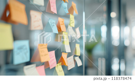 Business people meeting at office and use sticky notes to share idea. Brainstorming concept. Sticky note on glass wall
