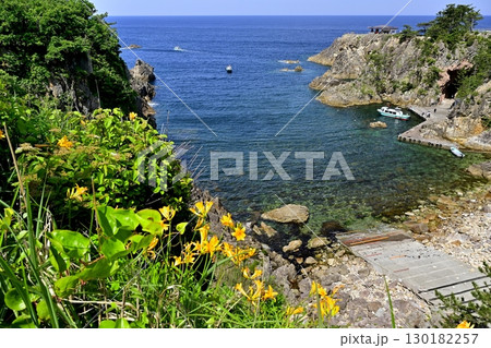 佐渡島の尖閣湾の遊覧船の港と断崖に咲くトビシマカンゾウ