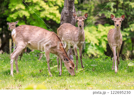 北海道夕張市、夏毛への換毛期のエゾシカの群れ【5月】