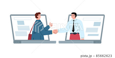 Online conference call between business partners. Characters shake hands in flat