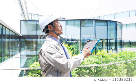 タブレットを見ながら建物をチェックするエンジニア