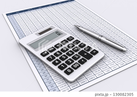 スポットライトに照らされた電卓と数字の書類、事務や経理の計算イメージ