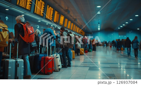 Out of focus image of people waiting in line for check-in on flight at airport terminal