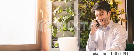 Small business development. Cheerful businessman working on laptop and talking on phone in cafe, free space