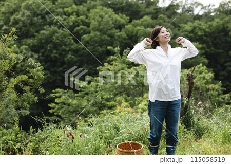 野山で収穫する女性