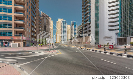Dubai Marina with Skyscrapers timelapse hyperlapse and traffic on the street near concrete road bridge through the canal
