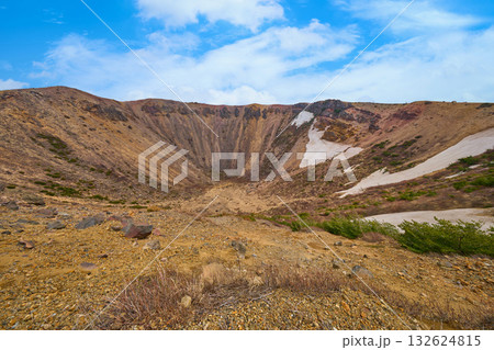 福島県福島市の吾妻小富士の西側稜線から残雪の火口を見る