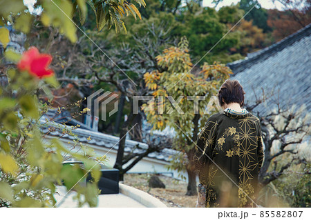日本庭園と着物女性