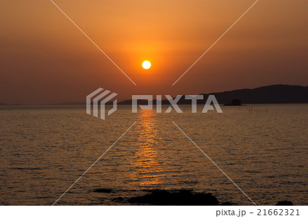「日本百景」赤穂御崎の夕景、先端の畳岩と遠景に家島諸島、沖合いにある小さな珍しい灯台