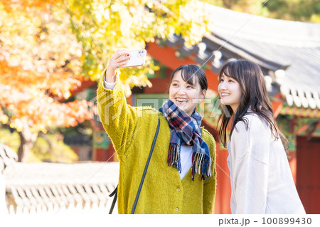 秋の観光地で記念撮影する女性