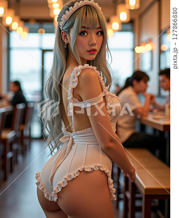 カフェで笑顔を見せるメイド風の女性 セクシーな衣装とカメラ目線 [AI生成画像]