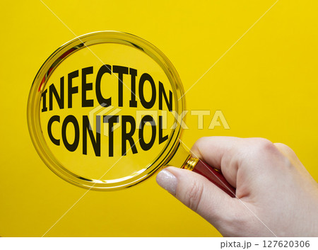 Infection Control symbol. Magnifying Glass with Concept word Infection Control. Businessman hand. Beautiful yellow background. Business and Infection Control concept. Copy space