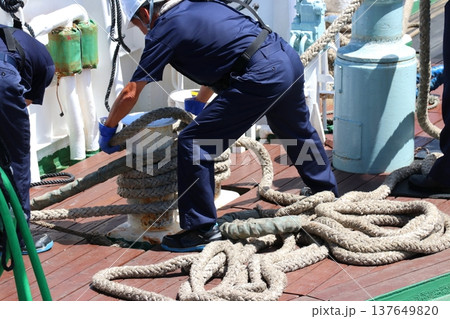 船の甲板、舫い綱の巻き取り作業中の乗組員