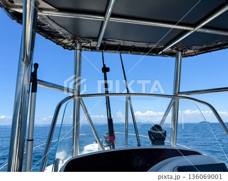 快晴の海を進むボート操船席からの眺め
