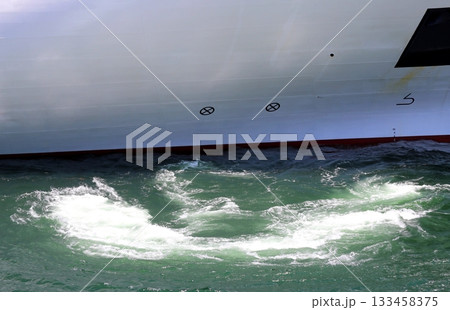 埠頭に接岸中の大型船:船首部バウスラスターの作動により海面に生じた渦