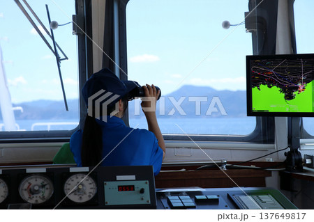 双眼鏡を手に前方を監視する船舶の乗組員(女性・後ろ姿)