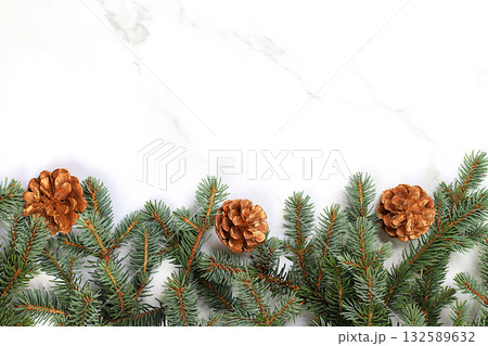 Christmas and New Year 2024 background with blue fir branches with holiday decorations and pine cones on a light marble table, banner for holiday screen, template for design. Holiday card,