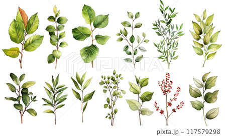 Botanical Illustration of Various Green Leaves and Branches on White Background