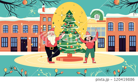 Christmas celebration Santa and woman dancing around decorated tree in snowy town square festive atmosphere colorful buildings holiday cheer