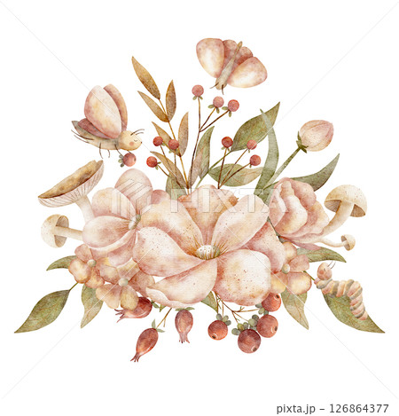 Watercolor illustration autumn bouquet flowers, leaves, mushrooms, berries, insects moth butterfly caterpillar. Harvest hand drawn on isolated background for design cards poster holiday clothes dishes