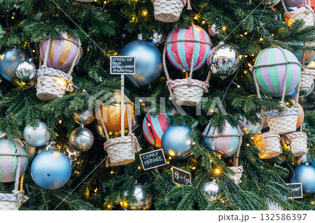 New Year's colorful trees in front of the Central Department Store in Moscow on Kuznetsky Most