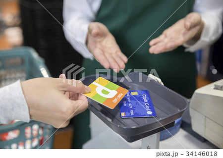 スーパーレジでポイントカードとクレジットカードを使う女性