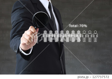 顧客や消費者の支持率やシェア率を虫眼鏡で分析するビジネスマンのイメージ画像