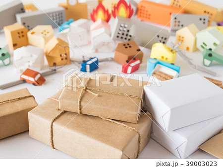 地震で壊れた街並みと救援物資のイメージ