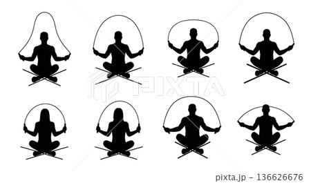 Black Solid Seated Jump Rope Silhouettes Set of Six on White Background