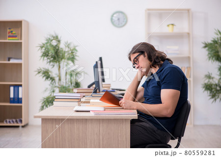 Young male student preparing for exams in the classroom
