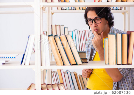 Young male student preparing for exams at library
