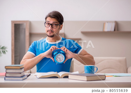 Young male student studying at home in time management concept