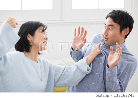 夫に殴りかかる妻と怯える夫