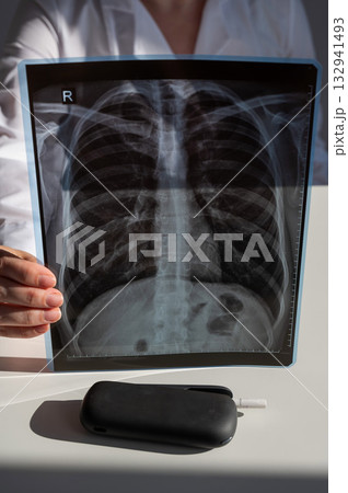 Doctor holding x-ray of lungs with vape in background.