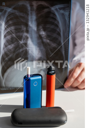 Electronic cigarette, regular cigarette and disposable vape on x-ray of lungs.