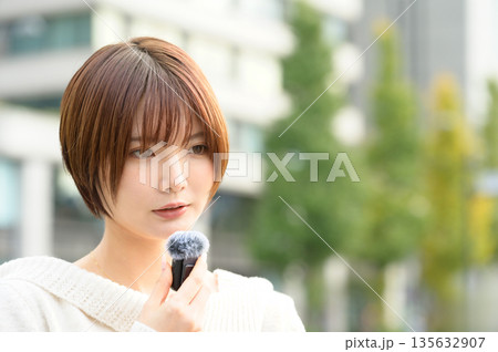 放送局のスタジオで案内・解説をするクリップボード女性 撮影協力:スカパー東京メディアセンター
