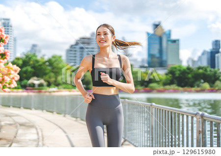 Southeast asian woman smiling running jogging at outdoors park in the morning