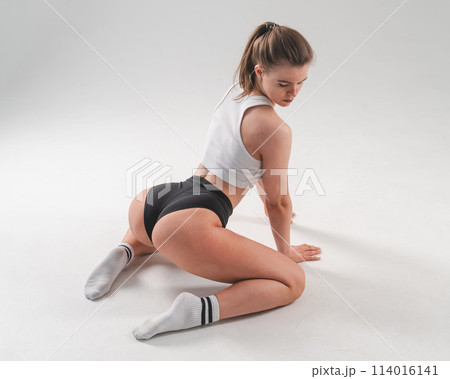 A woman in shorts sits with her back on a white floor. Beautiful butt. Vertical photo.
