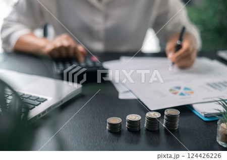Finance bank tax expense accounting budget money businessman hand use calculator Financial calculate accountant close up calculator with graph chart write office desk Business expense analysis saving