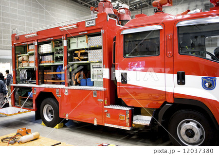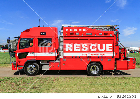 消防署で出動前待機中の特別高度工作車と救助工作車Ⅱ型の消防車
