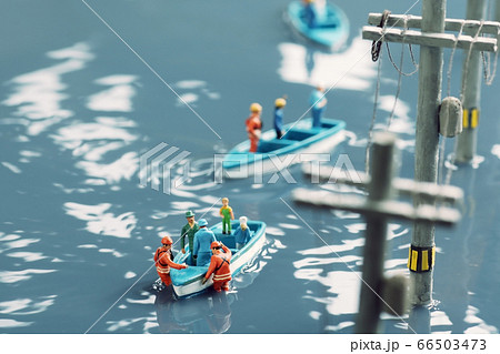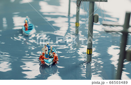 水害にあった街と救命ボートで救助活動をする救助隊のジオラマの風景