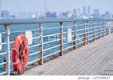 救護用の浮き輪が備え付けられた水辺のフェンス