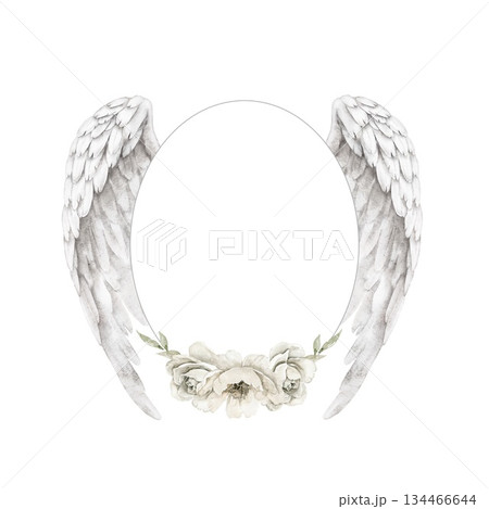 Hand drawn illustration of oval frame with large angel wings and off white flowers at the base. Designed for memorial card, funeral invitation, sympathy note, remembrance ceremony or spiritual project