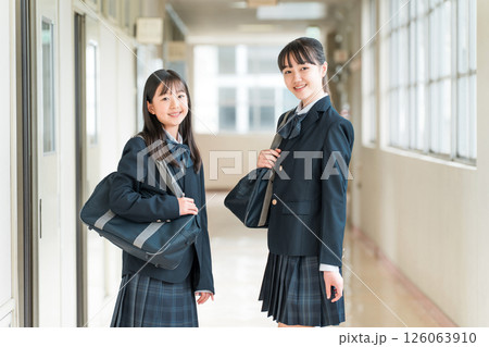 学校の廊下にいる制服姿の女子中学生,女子高生