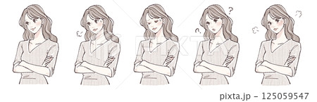 腕を組む・悩み・考える・迷い・怒りを表現する女性の表情5点イラストセット