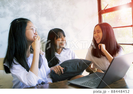 Happy schoolfriends walking to school, preparing homework, sharing snack during lessons break