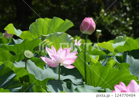 大賀蓮の花の開花と蕾と花びらが散った花托